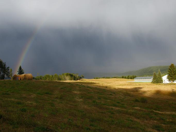 Keywords: thunderstorm dark sky rainbow weather clouds landscape scenery nature british columbia canada hay balls farmland agriculture buildings golden meadow bale countryside