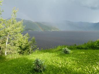 Keywords: thunderstorm rain rainbow canim lake british columbia canada scenery landscape weather glowing mountains water hills scenic nature clouds