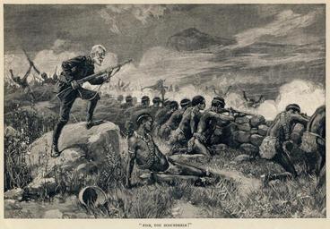 Keywords: Thure de Thulstrup - H. Rider Haggard - Maiwa's Revenge - Fire, you scoundrels.png wikitable <big>This is the archival version of File Thure de Thulstrup - H Rider Haggard - Maiwa's_Revenge_- Fire you scoundrels jpg Due to a bug in the thumbnailing software large PNGs do not display at the moment; however this is an exceedingly rare image and without this information would be lost to JPEG artefacts It should not under any circumstances be deleted This is the archival version of the cleaned up version; for the original scan see File Thure de Thulstrup - H Rider Haggard - Maiwa's_Revenge_- Fire you scoundrels original scan png</big> Illustration from H Rider Haggard's Maiwa's Revenge Chapter VII by Thure de Thulstrup The scene shows Allan Quatermain ordering the men to fire after getting them to wait until the most opportune moment Now they are going to begin I thought to myself and I was not far wrong for in another minute the body of men divided into three companies each about five hundred strong and heralded by a running fire charged at us on three sides Our men were now all well under cover and the fire did us no harm I mounted on a rock so as to command a view of as much of the koppie and plain as possible and yelled to our men to reserve their fire till I gave the word and then to shoot low and load as quickly as possible I knew that like all natives they were sure to be execrable shots and that they were armed with weapons made out of old gas-pipes so the only chance of doing execution was to let the enemy get right on to us On they came with a rush They were within eighty yards now and as they drew near the point of attack I observed that they closed their ranks which was so much the better for us Shall we not fire my father sung out the captain No ”confound you I answered Sixty yards ” fifty ” forty ” thirty Fire you scoundrels I yelled setting the example by letting off both barrels of my elephant gun into the thickest part of the company opposite to me Harper's New Monthly Magazine Vol LXXVII No 459 26 p 351 1888-08 Creator Thure de Thulstrup 1930 File Thure de Thulstrup - H Rider Haggard - Maiwa's_Revenge_- Fire you scoundrels jpg Restored JPEG File Thure de Thulstrup - H Rider Haggard - Maiwa's_Revenge_- Fire you scoundrels png Restored Archival PNG File Thure de Thulstrup - H Rider Haggard - Maiwa's_Revenge_- Fire you scoundrels original scan png Original scan PNG Minor cleanup levels adjustment crop Henry Rider Haggard Maiwa's RevengeThure de Thulstrup Allan Quatermain 1888 |