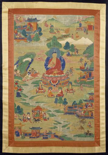 Keywords: Tibetan - Buddha Shakyamuni with "Jataka" Tales - Walters 35140.jpg The Buddha Shakyamuni who lived in the 6th-5th century BC is here shown telling stories of his previous existences all of which he remembered and many of which he related to his disciples At left for instance the Buddha-to-be is an elephant who jumped to his death from a cliff so that people could feast on his body At bottom right he is a wild buffalo who explains that he will not seek revenge on a monkey that had tormented him late 17th-early 18th century watercolor cotton Extreme outside cm 131 5 66 3 ; Image cm 65 7 42 3 accession number 35 140 12985 John and Berthe Ford Baltimore date and mode of acquisition unknown Walters Art Museum John Berthe Ford 1987 place of origin Tibet Walters Art Museum license 2D Tibetan art in the Walters Art Museum Paintings from Tibet Paintings in the Walters Art Museum Jataka Paintings of Life of Gautama Buddha |