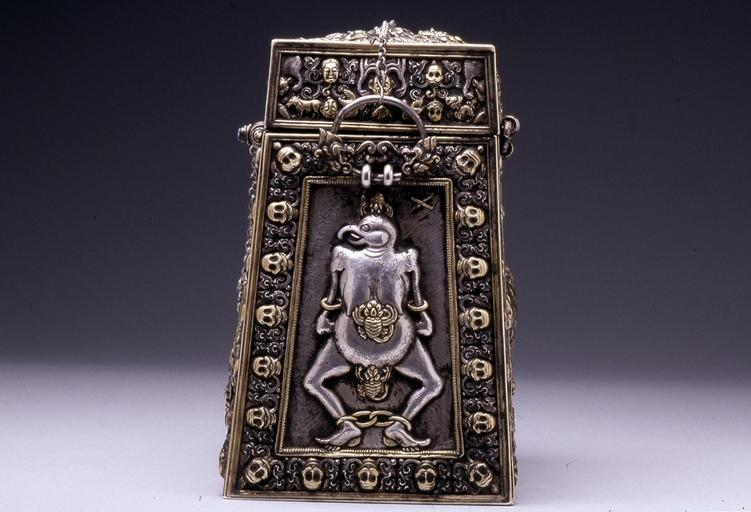 | Keywords: Tibetan - A Ritual Box - Walters 572299 - Right Side.jpg The surfaces of this silver and gilt box are richly embellished with symbols and mantras associated with the destruction of malevolent spirits On the front is a symbolic representation of the protective female deity Lhamo The precise function of the box within a ritual context is unknown but it may have served as a storage container for other esoteric objects used within a tantric ritual The inclusion of skulls as border motifs and the manacled creatures at either end are suggestive of both protection of the contents and the use of the box in purifying rites or exorcisms The inscriptions include spells using Sanskrit words and Tibetan curses such as May its voice sink in darkness and dissolve Part of the ritual seems to have involved capturing the spirit and part subduing it There may also be references to yogic activities such as controlled-breathing exercises The complexity of the decoration is indicative of a date in the 18th century making this a relatively late example of the Tibetan tantric tradition century 18 silver with gilding and turquoise cm 30 5 30 5 15 2 accession number 57 2299 23140 Kathmandu Nepal date and mode of acquisition unknown John and Berthe Ford Baltimore Winter 1983 by purchase Walters Art Museum John Berthe Ford 2007 Desire and Devotion Art from India Nepal and Tibet in the John and Berthe Ford Collection The Walters Art Museum Baltimore; Birmingham Museum of Art Birmingham; Santa Barbara Museum of Art Santa Barbara; Albuquerque Museum Albuquerque 2001-2003 place of origin Tibet Walters Art Museum license Tibetan art in the Walters Art Museum Metalwork of Tibet Silver boxes Lhamo Exorcism |