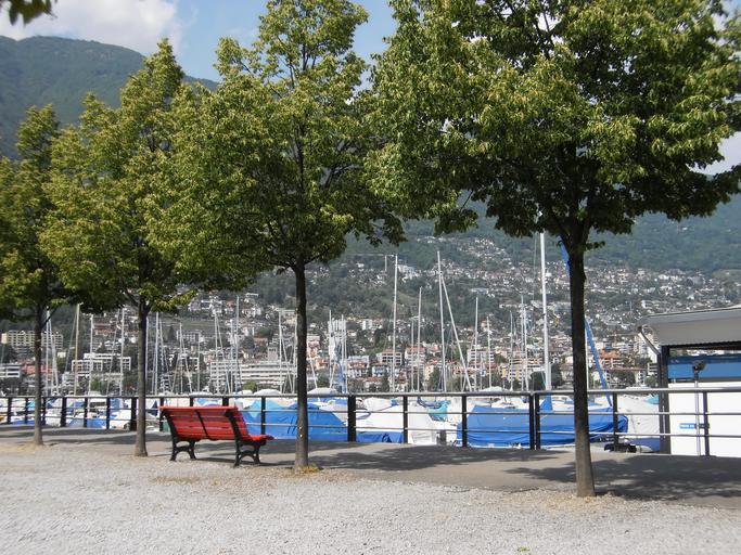 Keywords: ticino port boats bench trees boot locarno switzerland