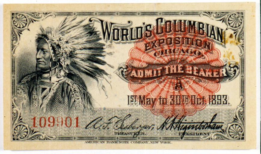 Keywords: world's columbian exposition worldscolumbianexposition ticket world's fair worldsfair 1893 chicago illinois white city whitecity commons:event=commonground2009 Portrait of Native American with feather headdress. Admit the Bearer. 1st May to 30th October, 1893. Ticket from World's Columbian Exposition Chicago. Printed by American Bank Note Company, New York. Digital Identifier: GN86844_6c Original material: 35mm color slide Date photo taken: 1993 World's Columbian Exposition Collection at The Field Museum Portrait of Native American with feather headdress. Admit the Bearer. 1st May to 30th October, 1893. Ticket from World's Columbian Exposition Chicago. Printed by American Bank Note Company, New York. Digital Identifier: GN86844_6c Original material: 35mm color slide Date photo taken: 1993 World's Columbian Exposition Collection at The Field Museum |