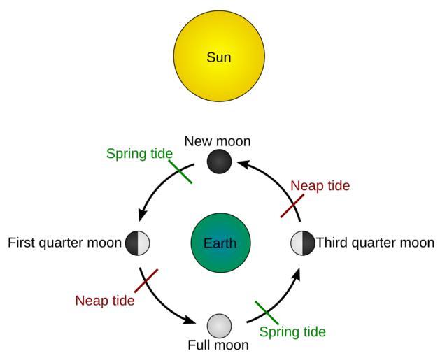Keywords: Tide schematic.svg en Tides schematic Due to the bathymetry of some areas neap and spring tides reach their maximum force 2 days after the first quarter moon third quarter moon and new moon full moon respectively In the absence of complications due to bathymetry spring tides are exactly at the full and new moons and neap tides are exactly at the one-quarter and three-quarter moon Every six hours the water also lowers or heightens; as such four tides are created Low water spring tide<br/> High water spring tide<br/> Low water neap tide<br/> High water neap tide 2009-10-06 Public domain image File Tides schematic JPG which was based on an image in Leidraad voor het Stuurbrevet by Richard Vooren Paul Van den Keybus User KVDP SVG conversion by Surachit Other versions <gallery> Esquema-mareas svg language es Tide schematic de svg language de Tide schematic mk svg language mk </gallery> Original jpg drawing File Tides schematic JPG Other fields + Diagrams Tides Tides |