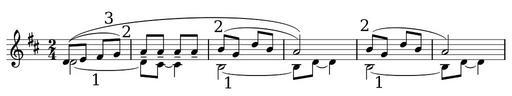 Keywords: Ties slurs and ligature.svg Sample notation of 1 ties 2 slurs and 3 ligatures Beispiel für 1 Halte- 2 Binde- und 3 Phrasierungsbögen tune Public domain children's song Fuchs du hast die Gans gestohlen author Ernst Anschütz 1780 1861 ; File self-created using Lilypond by FordPrefect42 SVG by Ysangkok 01-07-2007 User Ysangkok Original by User FordPrefect42 Image Ties slurs and ligature png LilyPond source <pre><nowiki> \key d \major \time 2/4 << \phrasingSlurUp \slurUp d'8 \ e' fis' g' a'_- a'_- a'_- a'_- b' g' d b' a'2 \ b'8 g' d b' a'2 \\ d'2~ d'8 cis'~ cis'4 b2~ b8 d'8~ d'4 b2~ b8 d'8~ d'4 >> </nowiki></pre> Source User FordPrefect42 Tie music Images with LilyPond source code Slurs |