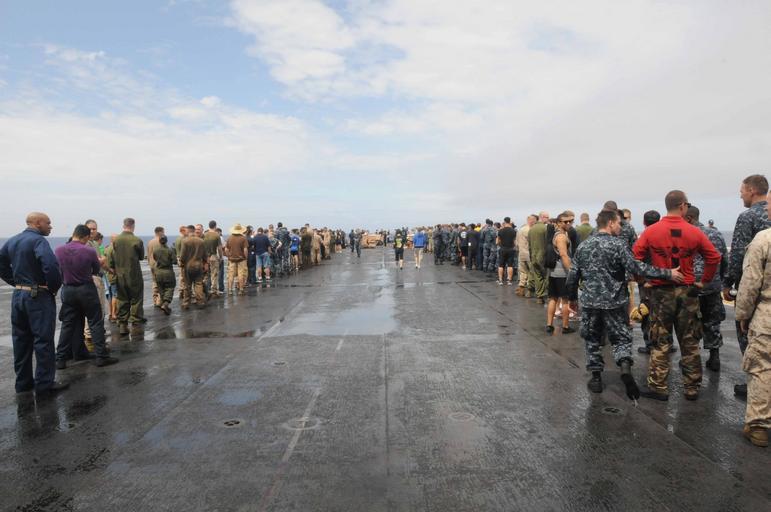 | Keywords: Tiger Cruise steel beach picnic 130508-N-HU377-020.jpg en Sailors Marines and their tigers wait in the serving line during a steel beach picnic on the flight deck of the amphibious assault ship USS Peleliu LHA 5 Tigers are embarked guest and family members of sailors and Marines who are stationed aboard Peleliu and the 15th Marine Expeditionary Unit Peleliu is the flagship for the Peleliu Amphibious Ready Group retuning from deployment to the western Pacific region with the amphibious transport dock ship USS Green Bay LPD 20 the amphibious dock landing ship USS Rushmore LSD 47 and the embarked 15th Marine Expeditionary Unit U S Navy photo by Mass Communication Specialist 3rd Dustin Knight/Released 2013-05-08 Petty Officer 3rd Class Dustin Knight https //www dvidshub net/image/929127 130508-N-HU377-020 2013-05-11 04 04 AT SEA PD-USGov-Military-Navy USS Peleliu LHA-5 15th Marine Expeditionary Unit USS Green Bay LPD-20 USS Peleliu LHA-5 USS Rushmore LSD-47 Images from DoD uploaded by Fæ |