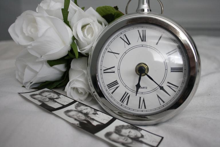 Keywords: time clock watch pocket watch hour o'clock late hurry memories photo strip black and white parents couple reminiscing mom and dad man and woman happy in love white roses bouquet flowers arrangement