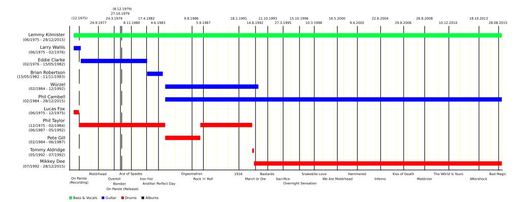 | Keywords: Timeline - Motörhead.svg Inkscape en Timeline of the rock band Motörhead Lineups and albums Range 1 1 1975 - 1 1 2016 Album release coordinates Days 1 1 1975 to release date / 10 Until Rock 'n' Roll 1987 Release date Chart entry de Zeitleiste der Rockband Motörhead Bandbesetzungen und Alben Bereich 1 1 1975 - 1 1 2016 Album Release Koordinaten Tage 1 1 1975 bis Release Datum / 10 Bis Rock 'n' Roll 1987 Release Datum Chart Einstieg own Roland Lehner 2011-01-07 Timelines of musical groups Motörhead Cc-zero |