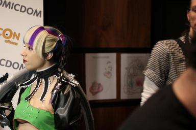 Keywords: Tira cosplay at Comicdom 2012 in Athens, Greece 36.JPG en A cosplayer wearing a self-made costume representing the Tira character from Soulcalibur V grants an interview to journalists from the MTV television channel and also poses for other the photojournalists' cameras at Comicdom 2012 an annual cosplay competition held at Hellenic American Union in Kolonaki Athens Greece Photo donated to the public domain free of copyright restrictions Journalistic use For Journalistic use 2012-03-31 18 15 20 own Cogiati cc-zero consent public place Cosplay of Tira Soulcalibur Green clothing female Cosplay at Comicdom 2012 Taken with Canon EOS 60D Taken with Canon EF 50mm F2 5 Compact Macro |