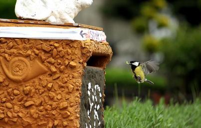 Keywords: tit bird fly flight feed feeding animals nature small bird plumage cute sitting songbird yellow birds nest bird's nest
