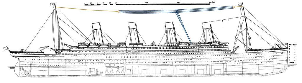 Keywords: Titanic antenne T 01.JPG fr Plan longitudinal du Titanic <br /> Antenne ground plane en T sur le navire Titanic Entre les deux mâts un câble élastique long de 60 m et de couleur bleu l'antenne en T d'une longueur horizontale de 120 m et d'une hauteur du brin verticale de 50 m <br /> L'ensemble entre les deux mâts distants de 183 m sur le navire La hauteur de l'antenne au-dessus des cheminées est de 15 m La longueur horizontale est constituée en quatre fils horizontaux en bronze au silicium d'une longueur de 120 m donc les 2 câbles intérieurs sont écartés de 2 40 m et les 2 câbles extérieurs sont écartés de 1 80 m des câbles intérieurs http //www le-titanic fr/station-de-radio-du-titanic/l-installation-sans-fil-de-marconi-du-titanic/ Titanic L ™installation sans fil de Marconi du Titanic<br /> T-aerials on ships since they could be strung between masts This is the antenna of the RMS Titanic which broadcast the rescue call during her sinking in 1912 It was a multiwire T with a 50 m vertical wire and four 120 m horizontal wires 1911-05-26 File Titanic side plan 1911 png + own F1jmm inconnue anonyme Unknown <gallery> File Titanic side plan with lifeboats png File Titanic side plan 1911 png </gallery> PD-old picture manager bright F1jmm BadJPEG Uploaded with UploadWizard T and inverted L antennas Wire antenna Photos by User F1jmm Titanic plans and diagrams Antenna diagrams |