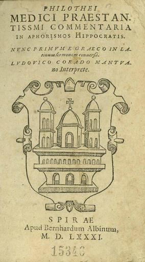 Keywords: Titel Philothei medici praestantissimi commentaria in aphorismos Speyer 1581.jpg Titelblatt mit Druckermarke von Philothei medici praestantissimi commentaria in aphorismos Speyer Albinus 1581 http //www kiefer-auktionen de Kiefer Auktionen 1581 Albinus PD-old-100 Images from Kiefer Auktionen 1581 books Coats of arms of Speyer |