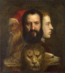 | Keywords: Titian - Allegorie der Zeit.jpg and workshop Marco Vecellio 1545; die dreiköpfige Tier - Wolf Löwe Hund - ist ein Symbol der Klugheit The three heads allude to the three ages of man youth maturity and old age; left Titian at old age; middle his son Orazio who died of the plague the same year as Titian; right his cousin and heir Marco Vecellio 1545; the triple-headed beast - Wolf lion and dog - is a Symbol of prudence Alegoría del tiempo gobernado con prudencia Las tres cabezas aluden las tres edades del hombre juventud madurez y vejez ; la triple cabeza de las bestias representan al lobo al león y al perro símbolos de la prudencia ca 1550 1565 Oil on canvas size cm 75 5 68 4 Institution National Gallery London 02 06 Ferrara and Bologna - currently closed 2014-09 object history credit line Presented by Betty and David Koetser 1966 accession number NG6376 http //www nationalgallery org uk/paintings/titian-and-workshop-an-allegory-of-prudence Official gallery link Assessments 1 Titian's Allegory of Prudence PD-old-100 Allegory of Prudence by Titian Marco Vecellio |