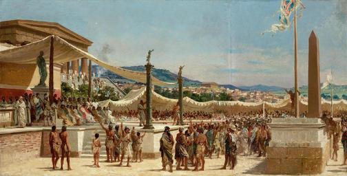 Keywords: Tito Quinto da la Liberta ai greci - Giuseppe Sciuti.jpg it Tito Quinto da la Liberta ai greci Titus Quinctius offers the liberty to the Greeks Oil on canvas 83 x 195 cm 1879 http //www dorotheum com/blog/sicilian-heritage-sciuti-giuseppe/ Dorotheum Creator Giuseppe Sciuti other versions PD-old-100 Giuseppe Sciuti Titus Quinctius Flamininus Obelisks in art |
