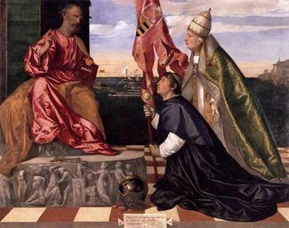 Keywords: Tizian 105.jpg Artwork Q3805922 creator Titian between 1506 1511 oil canvas size cm 146 184 Institution Koninklijk Museum voor Schone Kunsten Antwerp object history credit line ProvenanceEvent commission Langswitch von Bischof of bishop Jacopo Pesaro accession number The Yorck Project 10 000 Meisterwerke der Malerei DVD-ROM 2002 ISBN 3936122202 Distributed by DIRECTMEDIA Publishing GmbH WGA link 22731 http //www wga hu/art/t/tiziano/01_1510s/04popeal jpg http //www wga hu/html/t/tiziano/01_1510s/04popeal html http //mail wikipedia org/pipermail/wikide-l/2005-April/012195 html 100px 100px painting religious Italian 1501-1550 PD-old-100 PD-Art-YorckProject Jacopo Pesaro presented to St Peter by Pope Alexander VI WGA form painting WGA type religious WGA School Italian WGA time period 1501-1550 16th-century paintings of Christian saints Italian paintings in the Royal Museum of Fine Arts Antwerp Titian |