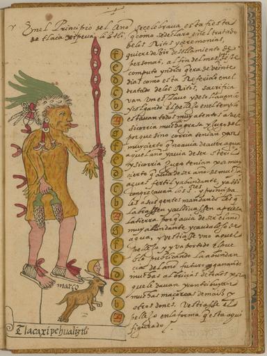 | Keywords: Tlacaxipehualiztli, Festival of the Flaying of Men, the Second Month of the Aztec Solar Calendar WDL6735.png Artwork ru Това Хуан де около 1546 г около 1626 г fr Tovar Jean de 1546-1626 env en Tovar Juan de circa 1546-circa 1626 zh 胡安·德·托瓦尔,约 1546 年 - 约 1626 年 pt Tovar Juan de por volta de 1546-por volta de 1626 ar خوان دو توفار، حوالي 1546-حوالي 1626 es Tovar Juan de circa 1546-circa 1626 ru Тлакашипеуалицтли п аздник сди ания кожи с людей 2-й месяц солнечного календа я ацтеков fr Tlacaxipehualiztli fête de l'écorchement des hommes second mois du calendrier solaire aztèque en Tlacaxipehualiztli Festival of the Flaying of Men the Second Month of the Aztec Solar Calendar zh 阿兹特克太阳历的第 2 个 剥人皮 pt Tlacaxipehualiztli Festival do depelamento de homens o segundo mês do calendário solar asteca ar تلاكاشيبيواليستلي، مهرجان سلخ الرجال، الشهر الثاني من التقويم الشمسي الأزتكي ru Кодекс Това а авто ом кото ого считается мексиканский иезуит XVI века Хуан де Това соде жит под обную инфо мацию об об ядах и це емониях ацтеков известных также как мешика Кодекс п оиллюст и ован 51 аква ельным исунком на полную ст аницу Рисунки в кото ых наблюдается значительное влияние пиктог афических укописей доколониальных в емен обладают исключительными художественными достоинствами Рукопись состоит из т ех азделов В пе вом азделе описана исто ия путешествий ацтеков до п ибытия испанцев Вто ой аздел п едставляет собой иллюст и ованную исто ию ацтеков В т етьем азделе находится календа ь Това а в кото ом п ослеживается календа ный цикл ацтеков с месяцами неделями днями воск есными буквами и елигиозными п аздниками х истианского 365-дневного года а этой иллюст ации из т етьего аздела изоб ажен бог Шипе Тотек или его пе сонификация одетый в тунику из сод анной человеческой кожи и высунувший язык а голове у него убо с зелеными пе ьями на ногах сандалии В левой уке он де жит г емящий посох В п авой уке видны два связанных початка маиса или куку узы К повязке на голове п ивязано оленье копыто С мочки п авого уха свисает аздвоенная золотая подвеска У его ног изоб ажен п ыгающий козел или ба ан Этот месяц оп еделяемый как ма т по аст ологическому символу ба ана или Овна знаменовал собой п азднество Тлакашипеуалицтли сди ания кожи с людей есяц п едставлен изоб ажением Шипе Тотека нашего господина-с-обод анной-кожей Г емящий посох является одним из ат ибутов этого бога как и два соединенных початка маиса Оленье копыто связано с охотничьими об ядами в честь бога Золотая подвеска под названием Теокуитланакочтли также является символом этого бога <br>Аст ология; Календа ь ацтеков; Боги ацтеков; Ацтеки; Календа и; Кодекс; Индейцы ексики; Ко енные на одности; езоаме ика; Кодекс Това а fr Le codex Tovar attribué à Jean de Tovar jésuite mexicain du XVI<sup>e</sup> siècle contient des informations détaillées sur les rites et les cérémonies des Aztèques également connus sous le nom de Mexicas Il est illustré de 51 aquarelles de la taille d'une page Fortement influencées par les manuscrits pictographiques de la période précontact ces peintures sont d'une qualité artistique exceptionnelle Le manuscrit est divisé en trois sections La première section contient une histoire des voyages des Aztèques avant l'arrivée des Espagnols La deuxième section est une histoire illustrée des Aztèques Dans la troisième section le calendrier de Tovar transcrit un calendrier aztèque continu avec les mois les semaines les jours les lettres dominicales et les fêtes liturgiques d'une année chrétienne de 365 jours Cette illustration extraite de la troisième section montre le dieu Xipe Totec ou une personne l'incarnant la langue tirée et portant une tunique faite de peau d'humain écorchée Il porte une coiffe de plumes vertes et des sandales Il tient un bâton crécelle dans la main gauche et deux épis de maïs attachés ensemble dans la main droite Le bandeau de sa coiffe arbore un sabot de cerf Son oreille droite est ornée d'un pendant doré qui se divise en deux Une chèvre ou un bélier bondissant est représenté à ses pieds Ce mois assimilé à mars avec le signe astrologique du Bélier commémorait la fête de Tlacaxipehualiztli écorchement des hommes Il est représenté par une image du dieu Xipe Totec « notre seigneur l'écorché »