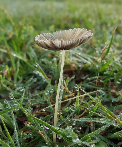 Keywords: toadstool fungi fungus plant cap grow dew dew drops morning dew glistening wet mycology close up ground level nature flora botany agaricales