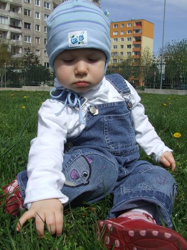 Keywords: toddler out on the grass blue cap sit
