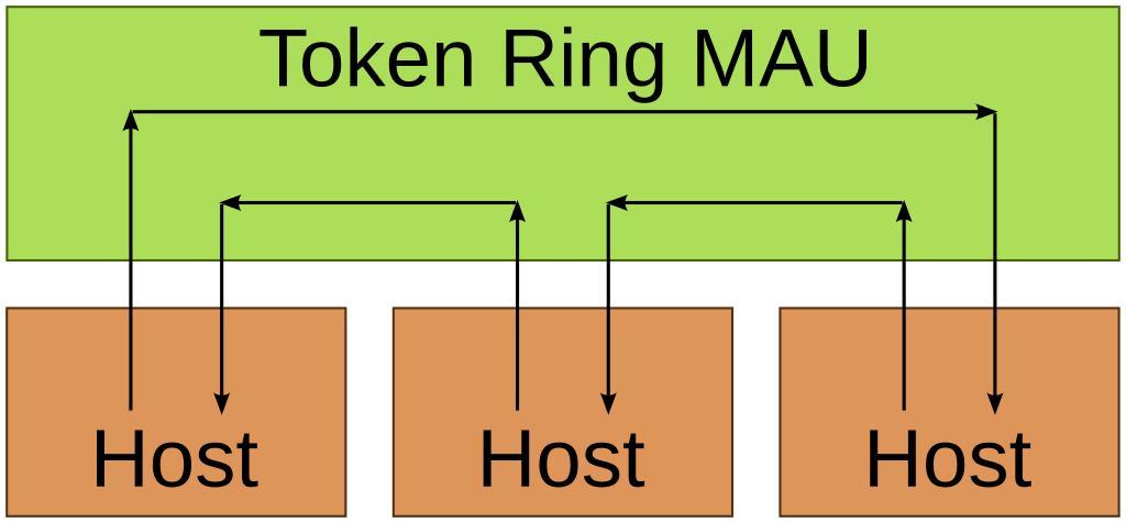 Keywords: TokenRingLogicalNetwork.svg Token Ring LAN Logical Network Layout with three hosts connected to a Multi-station Access Unit MAU Ring in/out ports are not shown for simplicity Own 2007-03-15 myself Original PNG version Token ring