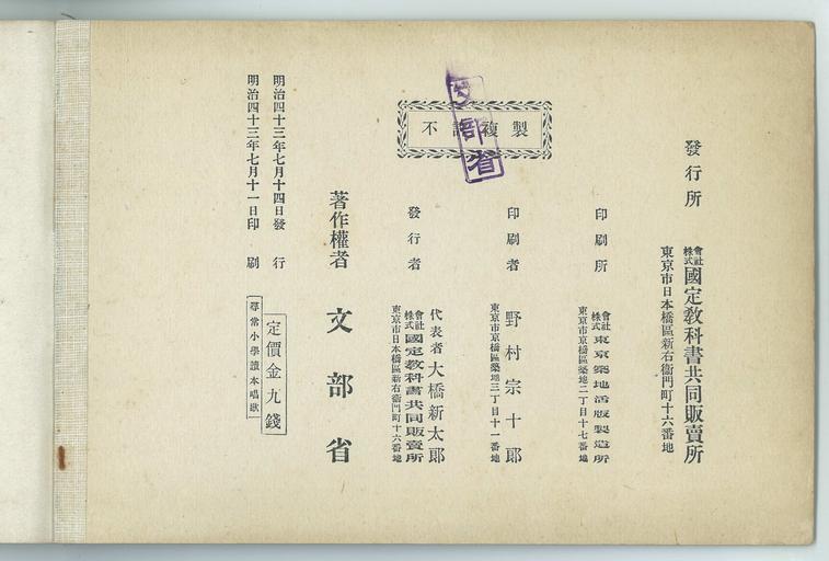 Keywords: TokuhonShoka1910 Colophon.jpg 尋常小学読 唱歌 奥付 不許複製 発行 株式会社 国定教科書共同販売 京市日 橋区新右衛 町十六番 印刷 株式会社 京築 活版製 京市京橋区築 二丁目十七番 < 印刷 野 宗十郎 <small> 京市京橋区築 三丁目十 番 発行 代表 大橋新太郎 株式会社 国定教科書共同販売 京市日 橋区新右衛 町十六番 著 権 文部 明治四十三年七 十四日発行 明治四十三年七 十 日印刷 定価金 銭 PD-Japan Jinjo Shogaku Tokuhon Shoka |