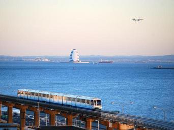 Keywords: Tokyo monorail and JAL a passenger plane.JPG ja 京モノレールとJALの旅客機 遠くにアクアラインの風の塔( 崎人工島)が見える 投稿 が撮影 toshinori baba 2010-12-23 Cc-zero Japan Airlines fleet 2002 livery Boeing 777-200 Tokyo International Airport TokyoMonorail 1000 and JAL B777