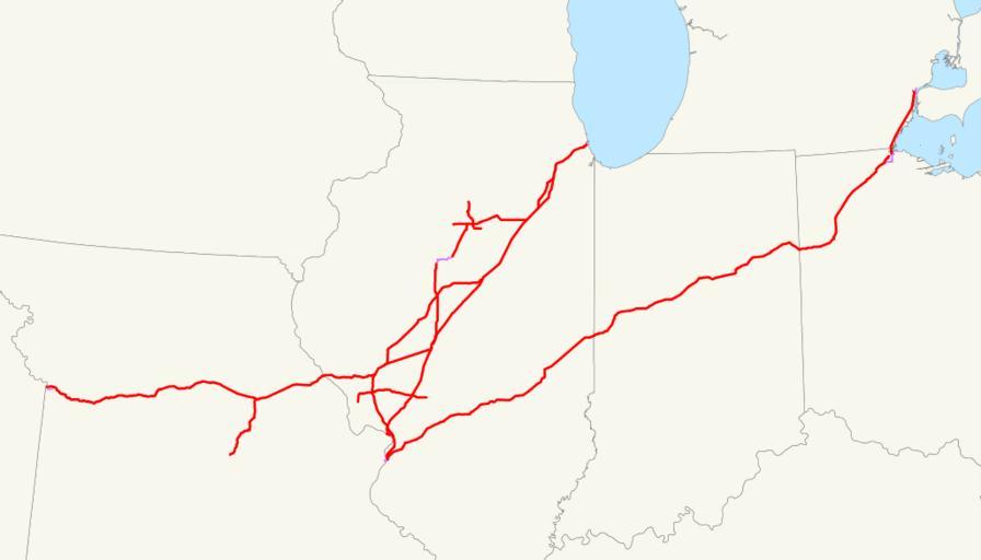 Keywords: Toledo, St. Louis and Western Railroad system map (1918).svg This is a map of the Toledo St Louis and Western Railroad Clover Leaf as of 1918 with trackage rights in purple Email me if you would like a copy of the GIS data I created modified from Bureau of Transportation Statistics North American Transportation Atlas Data or if you see any errors 2008-10-11 own assumed NE2 System maps of defunct U S railroads Toledo St Louis and Western Railroad |