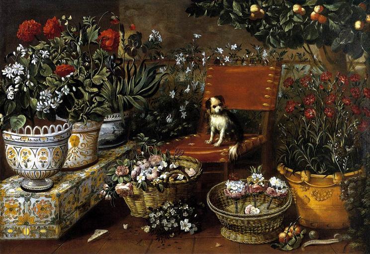 Keywords: Tomás Hiepes - Garden View with a Dog - WGA11415.jpg Artwork Creator Tomás Hiepes s 1660 Oil on canvas size cm 109 155 Institution Prado object history credit line accession number WGA link 11415 http //www wga hu/art/h/hiepes/view_dog jpg http //www wga hu/html/h/hiepes/view_dog html PD-old-100 painting still-life Spanish 1601-1650 Tomás Yepes Spanish Baroque paintings in the Museo del Prado Hiepes 17th-century oil on canvas paintings in Spain Vases in still-life paintings 17th-century paintings of dogs 17th-century paintings of flowers 1660s paintings in Spain Paintings of baskets WGA form painting WGA type still-life WGA School Spanish WGA time period 1601-1650 Sitting dogs Chairs in art 1660s still life paintings Dogs with flowers Dogs on chairs |