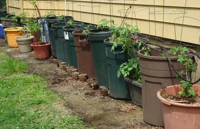 Keywords: Tomato plants growing in garbage barrels alongside house.JPG en An arrangement of tomato plants in garbage barrels with plenty of soil alongside a house in New Jersey The barrels provide stability for the wire concentric ring supports; further they help keep the tomato plants off the ground making it harder for chipmunks and squirrels to eat the fruit when they appear A drip hose extends along the line of barrels Tomato plants need lots of sun but they can perish during a heat spell when temperatures are above 90F for extended periods; if this happens plants should be covered with plastic to keep moisture in and watered frequently This area of Summit New Jersey does not have many deer 2014-05-10 own Tomwsulcer cc-zero Uploaded with UploadWizard Solanum lycopersicum Gardening |