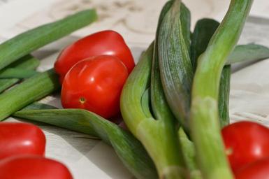 Keywords: tomatoes spring onions vegetables healthy vitamins frisch eat food bright red green bless you