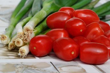 Keywords: tomatoes spring onions vegetables healthy vitamins frisch eat food bright red green bless you