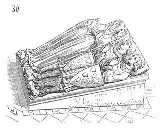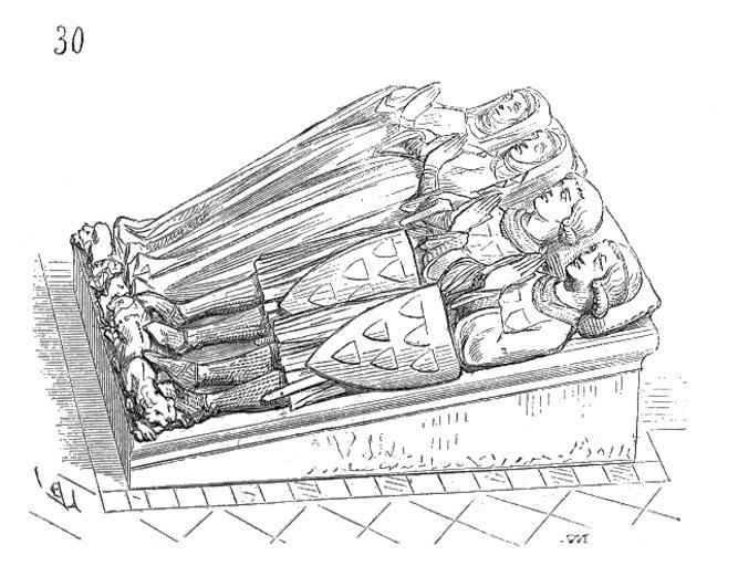 | Keywords: Tombeau.eglise.Chaloche.png Drawings by Eugène Viollet-le-Duc Shields Viollet-le-Duc People with ecu Il y a une sorte de monument intermédiaire entre ces derniers tombeaux et les plates-tombes ce sont des statues couchées sur un lit légèrement incliné et ayant au-dessus du pavé un faible relief Ces tombes étaient placées dans le chœurs des églises ou dans des chapelles de façon à être vues des fidèles et à ne pas gêner la circulation Il existait avant la révolution dans l'église de Chaloché au milieu du chœur un tombeau ainsi composé c'était celui de Thibaut seigneur de Mothefélon de Béatrix de Dreux sa femme de leur fils et de leur bru Les quatre statues étaient couchées sur un socle peu élevé en forme de lit de camp fig 30 ; les statues étaient peintes; les deux sires de Mothefélon avaient leurs mailles dorées et portaient des cottes armoyées de leurs armes qui sont de gueules aux six écussons d'or posés 3 2 et 1 Ce tombeau datait du commencement du XIV<sup>e</sup> siècle Dictionnaire raisonné de l'architecture française du XI<sup>e</sup> au XI<sup>e</sup> siècle ~ 1856 Eugène Viollet le Duc Viollet-le-Duc Recumbent effigies in Pays de la Loire Chaloche Kloster Chaloché Abbeys in Maine-et-Loire |