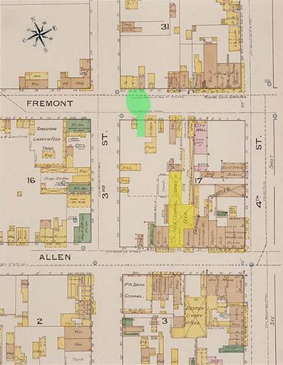 | Keywords: Tombstone lithograph map shootout.png 18 ft wide lot highlighted in green on Fremont Street between Fly's Photography Studio and the Harwood House and spread onto Fremont Street The O K Corral itself highlighted in yellow is located on Allen St The gunfight took place six lots west of the rear entrance to the corral This map is one of over 700 000 fire insurance map sheets produced by the Sanborn Map Company for more than twelve thousand American cities and towns from the 1870s until the 1950s These maps were prepared primarily to assist insurance underwriters in determining the risk involved in insuring individual properties The outline or footprint of each building is indicated and the buildings are color coded to show the construction material pink for brick; yellow for wood; brown for adobe Numbers inside the lower right corner of each building indicate how many stories the building had while the numbers outside the building on the street front refer to the street addresses allowing researchers to correlate these locations with census records and city directories Individual dwellings are marked with D or Dwg http //www loc gov/exhibits/treasures/trr016 html Library of Congress New York Sanborn Map and Publishing Company 1886 Tombstone fire insurance map of Tombstone Arizona 600px left 31 42 50 N 110 04 03 W region US-AZ_type event PD-USGov Tombstone Arizona Maps of Arizona |