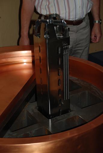 | Keywords: Top of a canister for waste nuclear fuel.JPG en Top of a canister for waste nuclear fuel; the iron insert of the copper canister contains channels for assemblies of nuclear fuel own Pieter Kuiper 2010-06-04 SKB Canister Laboratory Nuclear waste containers Friction welding |