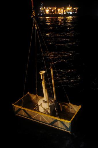 Keywords: Top-hat-horizon.jpg en A pollution containment chamber known as the top hat is lowered into the Gulf of Mexico by the motor vessel Viking Poseidon May 11 2010 The chamber will be used in an attempt to contain an oil leak that was caused by the mobile offshore drilling unit Deepwater Horizon explosion http //www deepwaterhorizonresponse com/go/doc/2931/547099/ U S Coast Guard photo by Petty Officer 3rd Class Patrick Kelley 2010-05-11 Deepwater Horizon oil spill PD-USGov |