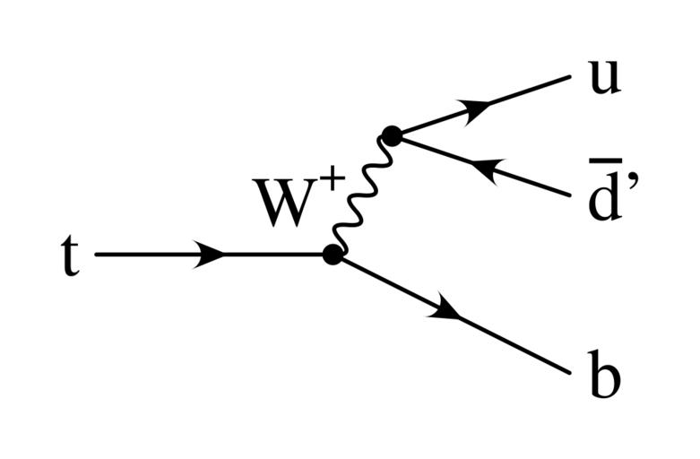 Keywords: Topdecay ud.svg en Decay t †’ b u <math>\overline d </math> of a top quark into a bottom quark an up and a down quark de Zerfall t †’ b u <math>\overline d </math> eines Top-Quarks in ein Bottom- ein Up- und ein Down-Quark 2016-07-03 own Blibla other versions cc-zero Feynman diagrams |