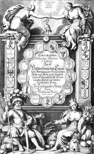 Keywords: Topographia Helvetiae.png Titelseite des Buches «Topographia Helvetiae» Um den Titel bilden die Wappen der XIII Alten Orte der Eidgenossenschaft eine Kette die den Bund symbolisiert 1 Zürich; 2 Bern; 3 Luzern; 4 Uri; 5 Schwyz; 6 Unterwalden; 7 Zug; 8 Glarus; 9 Basel; 10 Freiburg; 11 Solothurn; 12 Schaffhausen; 13 Appenzell Links und rechts auf den zwei Säulen die Wappen der Zugewandten Orte Links Fürstabtei St Gallen Grauer Bund Zehngerichtebund Rottweil Biel Rechts Stadt St Gallen Gotteshausbund Republik der 7 Zenden des Wallis Mühlhausen Genf Fürstentum Neuenburg Unten Allegorien auf die militärische Stärke der Eidgenossenschaft und auf den Reichtum und à berfluss der Städte Title of the book Topographia Helvetiae by Matthäus Merian The coat of arms of the XIII members of the Old Swiss Confederacy forming a chain around the title 1 Zurich; 2 Berne; 3 Lucerne; 4 Uri; 5 Schwyz; 6 Unterwalden; 7 Zug; 8 Glarus; 9 Bale; 10 Fribourg; 11 Solothurn; 12 Schaffhausen; 13 Appenzell Left and right on the two pillars the coat of arms of the associated members of the Confederacy On the left side Prince-abbacy of St Gall Grey League League of the Ten Jurisdictions Rottweil Biel On the right side City of St Gall League of God's House Republic of the Seven Zenden of Wallis Moulhuse Geneva Principality of Neuchâtel At the bottom two allegories of the military strenght of the Swiss Confederacy and the wealth of its cities Topographia Helvetiae Rhaetiae et Valesiae Das ist/ Beschreibung unnd eygentliche Abbildung der vornehmsten Stätte und Plätze in der Hochlöblichen Eydgenossschafft / Graubündten / Wallis / und etlicher zugewandten Orthen In dieser andern Edition mit sonderm fleiß durchgangen/ und von virgen Fehlern corrigirt / vermehrt und gebessert Franckfurt am Mayn 1654 1654 Creator Matthäus Merian PD-old-100 Engravings 1654 Merian Helvetiae Cornucopia Allegories Engravings by Matthäus Merian |