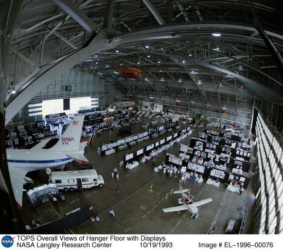 Keywords: TOPS Overall Views of Hangar Floor with Displays DVIDS711796.jpg en The Technology Opportunities Showcase TOPS featured NASA Langley technology innovations available to industry for licensing and commercialization The three-day event held at NASA's Langley Research Center October 19-21 1993 highlighted NASA's multiple use technology as a cornerstone in strengthening U S competitiveness in the world marketplace Under the Clinton administration's new direction to place government in a pivotal role to help industry non-aerospace companies small and minority businesses as well as universities are encouraged to market products derived from Federal lab innovations More than 160 exhibits featured advanced research and technology in high-speed aeronautics subsonics and hypersonics high-performance aircraft large-scale computing atmospherics space transport and spacecraft NASA Identifier L93-11792 2009-09-24 Glenn Research Center https //www dvidshub net/image/711796 711796 2012-10-10 17 06 WASHINGTON DC US PD-USGov Langley Research Center Images from DoD uploaded by Fæ |