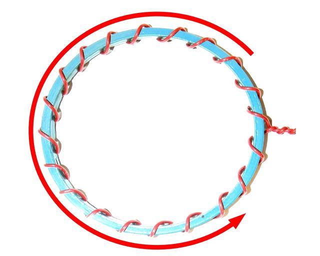 Keywords: Toroidal Inductor-Simple with Circumferential current.JPG en A simple winding on a toroidally shaped inductor gives rise to a circumferential current that causes a B field that is not contained to the winding own Constant314 Transformer schemas |