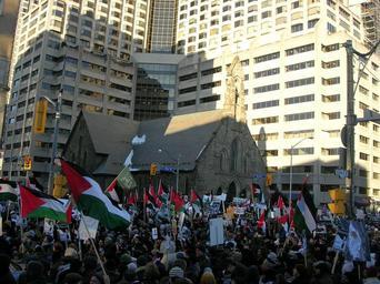 Keywords: Toronto protest Jan 3 2009.jpg en Photo taken of a protest on Jan 3 2009 against the ongoing military activities of Israel in the Gaza Strip Toronto Canada LivePeace 2009-01-03 Own file taken by myself Demonstrations and protests in support of Palestine in the Arab-Israeli conflict Palestinian diaspora in Canada |