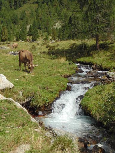 Keywords: torrent august alp cows forest mountain pasture cow cattle nature prato animals bovino colors horns dolomites grass south tyrol tranquility trekking water sunny milk