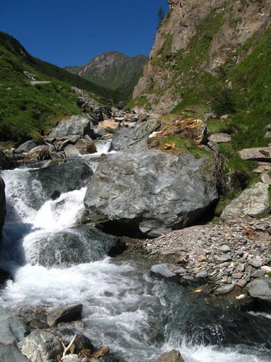 Keywords: torrent rock mountain river stone water stream trail walk clear landscape dolomites green meadows impetuous burst