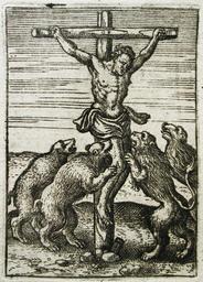 Keywords: Torture de cruce 1593.jpg Gravure représentant un crucifiement additionné de torture par animaux Book published c 1596 ca 1593 Author PD-old Torture in art 1590s