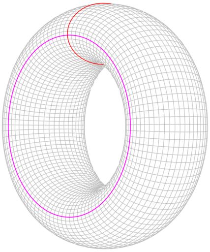 Keywords: Torus cycles2.svg torus Radius of magenta circle is <math>R 15</math> and radius of red circle is <math>r 5</math> Image created in maxima with gnuplot backend and subsequently cropped manually using a text editor 2014-04-15 13 32 31 own Krishnavedala 150px valid SVG gnuplot This plot was created using maxima with gnuplot backend <syntaxhighlight lang gnuplot > load draw R 15; r 5; eps 0 05; x R + r cos phi cos theta ; y R + r cos phi sin theta ; z r sin phi ; draw3d terminal svg file_name Torus2 xtics none ytics none ztics none axis_3d false view 90 330 xu_grid 50 yv_grid 100 surface_hide true color black enhanced3d false wired_surface true color gray line_width 0 5 parametric_surface z y x phi - pi pi theta - pi pi color red line_width 1 parametric r+eps sin t 0 R + r+eps cos t t - pi pi color magenta parametric -r R sin t R cos t t - pi pi xrange -20 20 ; </syntaxhighlight> cob cc-zero Torus Fundamental group SVG mathematics Images with Maxima CAS source code |