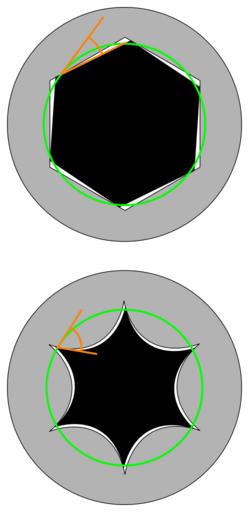 Keywords: Torx-hex-contact-angles-forces.svg en Diagram depicting the difference between a Torx head and a conventional hex head in respect of the angle between the contact plane and the circumferential force This diagram does not show a true Torx profile but illustrates the general principle applicable to Torx type drivers and fastener heads 2016-07-03 Re-drawn from en File Torx-hex-contact-angles-forces png Slashme other versions cc-zero Torx Bolts |