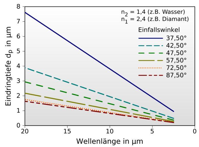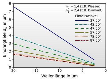 Keywords: Totalreflexion - Eindringtiefe vs Wellenlaenge.svg en Representation of the penetration depth <math>d_p \frac \lambda 2\pi\sqrt n_1 2\sin 2 \Theta - n_2 2 </math> of evanescent field as a function of incidence angle from the lot in the case of total reflection at the interface between a theoretical wavelength-refractive index material of the 2 4 eg diamond and 1 4 eg water The critical angle for these two materials is 36 275 ° The figure illustrates that the penetration depth near the critical angle is greater than half the wavelength of the incident light With increasing angle of incidence the penetration depth rapidly decreases and for the grazing incidence the penetration depth is approximately one tenth of the wavelength de Darstellung der Eindringtiefe <math>d_p \frac \lambda 2\pi\sqrt n_1 2\sin 2 \Theta - n_2 2 </math> des evaneszenten Felds in Abhängigkeit vom Einfallswinkel vom Lot im Fall der Totalreflexion an der Grenzfläche zwischen einem theoretischen Material der wellenlängenunabhängigen Brechzahl 2 4 z B Diamant und 1 4 z B Wasser Der Kritische Winkel bei diesen beiden Materialien beträgt 36 275° Zu sehen ist dass die Eindringtiefe in der Nähe des kritischen Winkels größer als die halbe Wellenlänge der einfallenden Strahlung ist Mit zunehmenden Einfallswinkel nimmt die Eindringtiefe rasch ab und beträgt für den streifenden Einfall näherungsweise 1/10 der Wellenlänge own Cepheiden 2010-06-30 Total internal reflection |