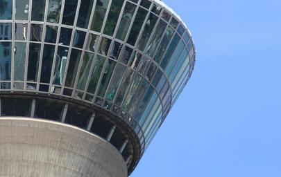Keywords: tower sky building architecture blue mirror mirroring reflect view tv tower radio tower high düsseldorf window facade modern city construction construction element element front window concrete reinforced concrete