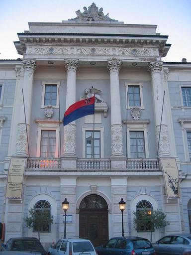 Keywords: TownHall-Piran.JPG Town Hall in coastal town Piran Slovenia photo Ziga 07 55 12 August 2006 UTC Piran Town Hall Flags in Slovenia Street lights in Piran Facades in Slovenia Corinthian columns in Slovenia 2006-08-12 own assumed Žiga