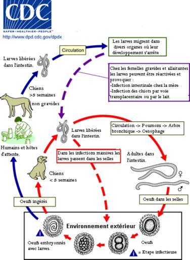 | Keywords: Toxocara canis LifeCycle(French version).GIF Toxocara caniNematoda Toxocaridae Toxocara_canis_LifeCycle French_version GIF Traduction en français de l ™image suivante Toxocara_canis_LifeCycle GIF Toxocara canis accomplishes its life cycle in dogs with humans acquiring the infection as accidental hosts Following ingestion by dogs the infective eggs yield larvae that penetrate the gut wall and migrate into various tissues where they encyst if the dog is older than 5 weeks In younger dogs the larvae migrate through the lungs bronchial tree and esophagus; adult worms develop and oviposit in the small intestine In the older dogs the encysted stages are reactivated during pregnancy and infect by the transplacental and transmammary routes the puppies in whose small intestine adult worms become established Thus infective eggs are excreted by lactating bitches and puppies Humans are paratenic hosts who become infected by ingesting infective eggs in contaminated soil After ingestion the eggs yield larvae that penetrate the intestinal wall and are carried by the circulation to a wide variety of tissues liver heart lungs brain muscle eyes While the larvae do not undergo any further development in these sites they can cause severe local reactions that are the basis of toxocariasis http //www dpd cdc gov/DPDx/HTML/ImageLibrary/Toxocariasis/ Toxocara_canis_LifeCycle GIF centre for disease control gov PD-USGov Toxocara c life cycle PD-USGov CDC lifecycles |