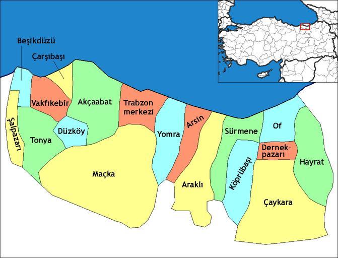 Keywords: Trabzon districts.png Map of the districts of Trabzon province in Turkey Created by Rarelibra 17 52 4 December 2006 UTC for public domain use using MapInfo Professional v8 5 and various mapping resources Edited by One Homo Sapiens Corrected text where İ Ş ı ğ or ş occurs in name Source statoids-com Increased font size and enhanced color differences among adjacent districts 2006-12-04 own assumed Rarelibra Maps of Trabzon Province Maps of districts in Turkey Districts of Trabzon Province |