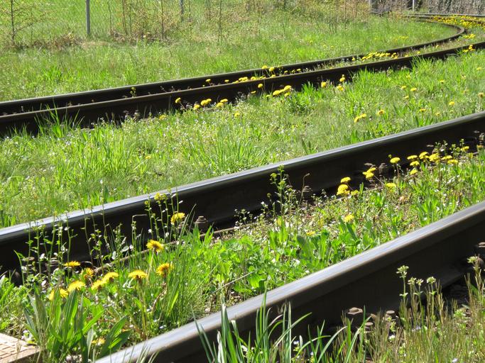 Keywords: track railroad track seemed meadow spring flowers green track bed landscape railway rails